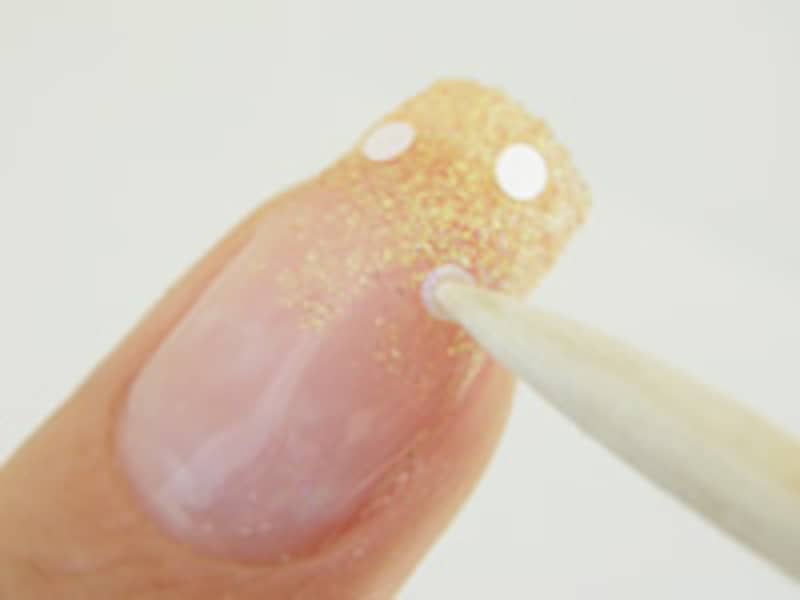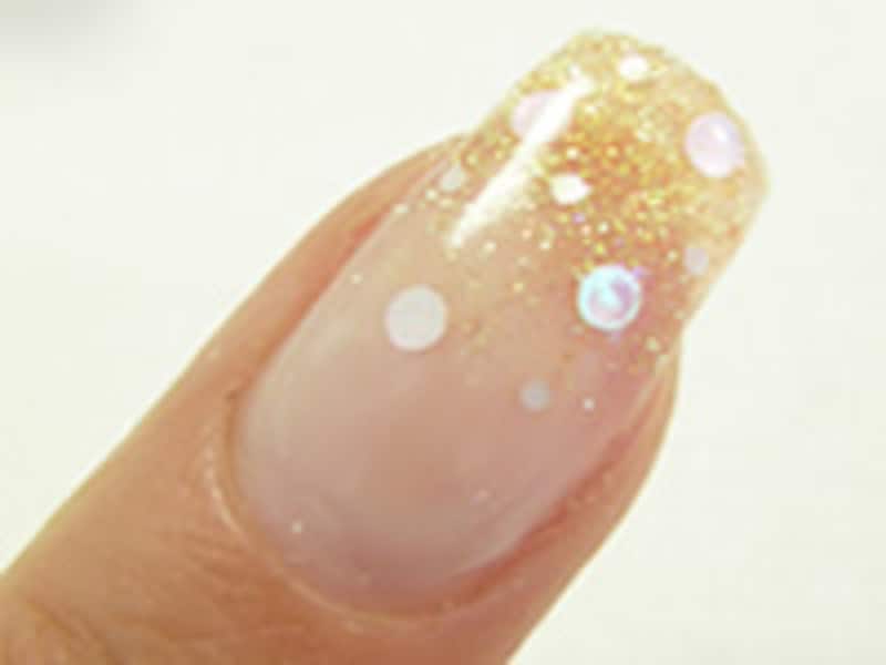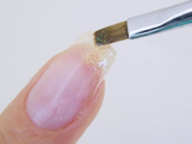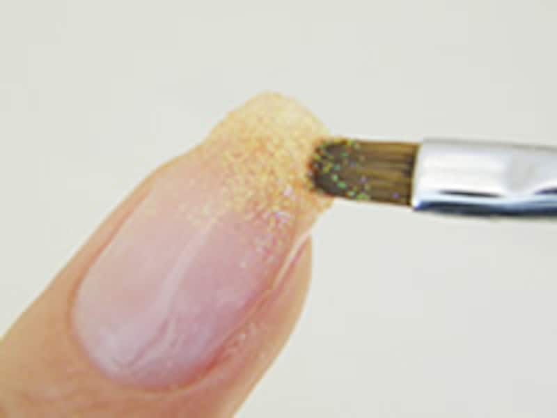 3. グリッターを混ぜたジェルで、爪の先端から塗っていきます。塗るというより、軽く叩く感じでぽんっぽんっぽん…と置いていく感じです。