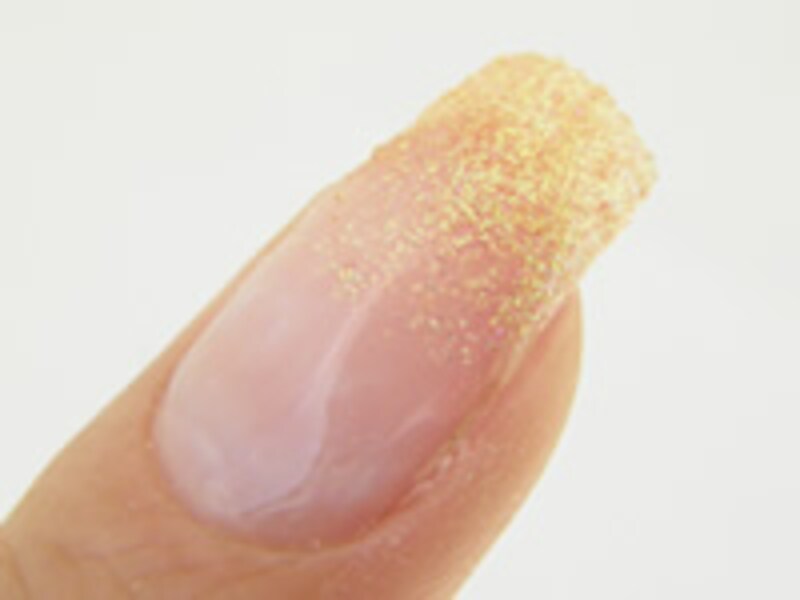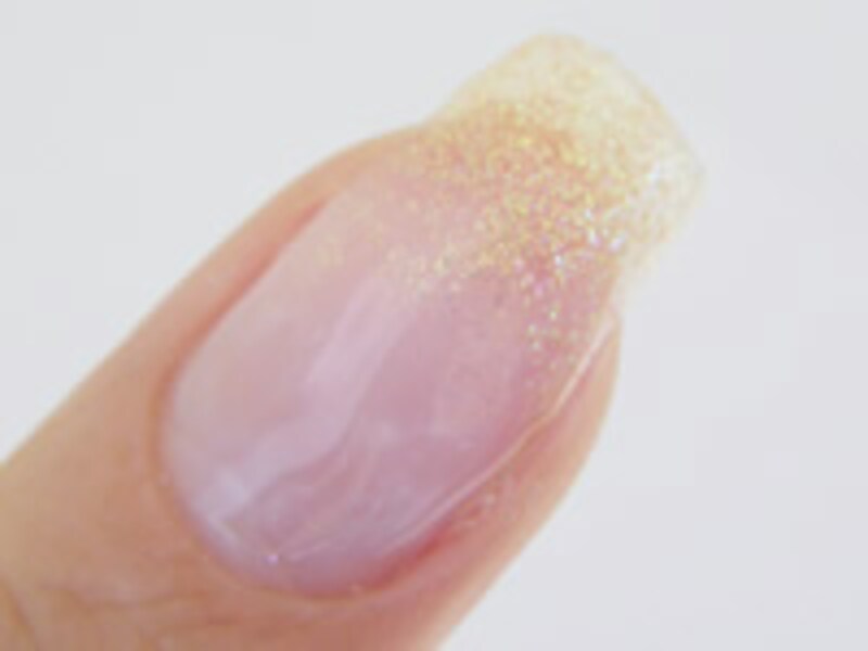 5. ライトから出し、2度目のグリッターを塗ります。先端が一番濃く、中央に向かうにしたがって薄くなるようにグラデーションを作ります。出来たらライトに入れて硬化させます。