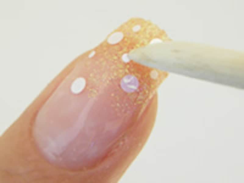 8. 続いて1mmサイズを置きます。あまりくっつきすぎないようにバランス良く置きます。イメージはソーダの炭酸です! ここまでがアートの手順です。一度ライトに入れて硬化し、トップのジェルを塗りましょう。