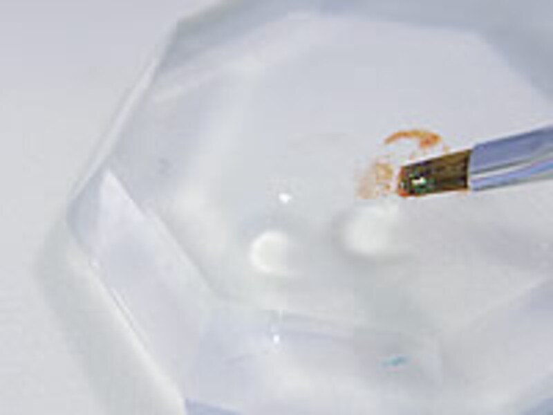 2. クリアージェルを筆ですくって、そこにグリッターを少量つけます。慣れないうちは、別の場所に少量のクリアージェルを取り、そこにグリッターを混ぜてから使うのがベター。 ジェルパレットがなければ、アルミホイルやペーパーパレットでOKです。