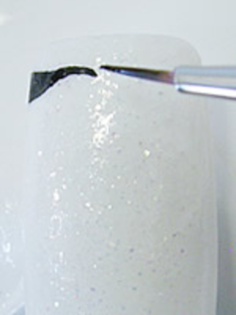 7. 続いて両サイドに1.5mmサイズのストーンを直線に並べていきます。フレンチネイルのようにカーブさせてもOKですが、今回はクールなイメージなのでシャープな直線をセレクトしました。ストーンを並び終えたらトップコートを全体に塗って完成です。