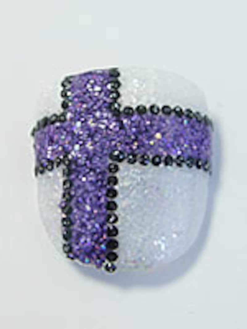 爪全体にクロスデザインを施してラインシールで縁取ったデザイン。シールを切り貼りする手間はあるけれど、インパクトが強いデザインに仕上がります。