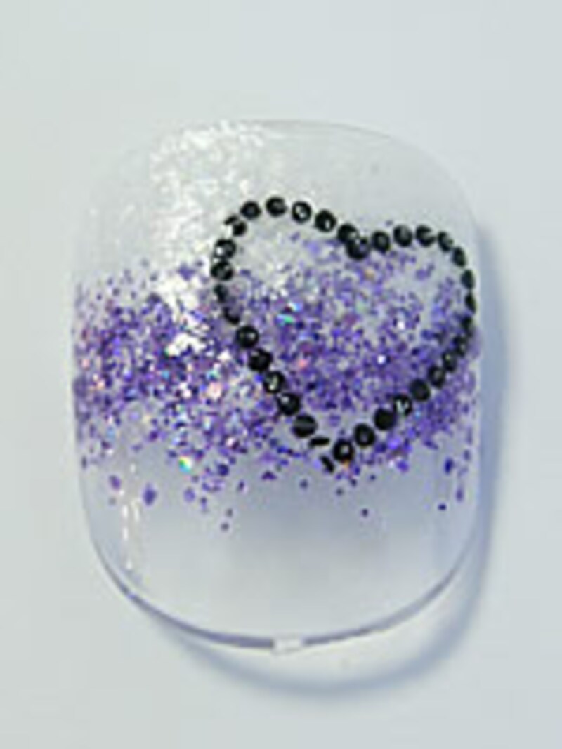 先端1/3をポリッシュで塗り、境目をグリッターでぼかしたダブルグラデーション。ポイントでラインシールを使ってハート型を作ります。シールは伸縮性があるのでカーブするデザインもOK。ベースカラーが乾いていればやり直しもできるので、ぜひ挑戦してみて下さい!