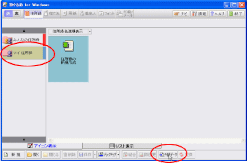 読み込んだ住所録を保存するグループ[マイ住所録]をクリックし、右下の[外部データ]をクリック