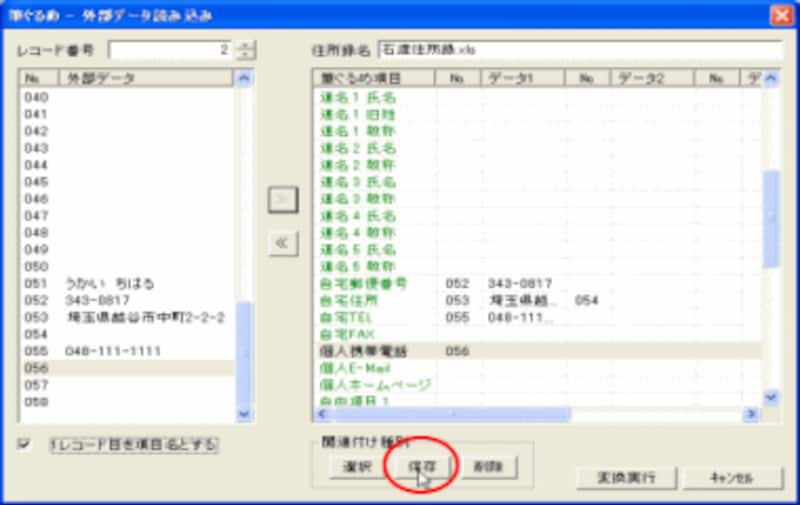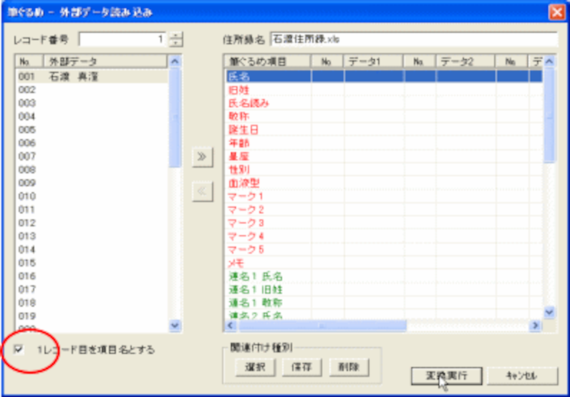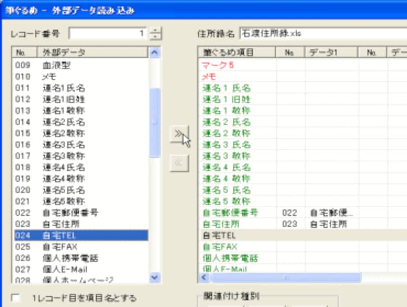 1.外部データで、[石渡真澄]を選択し、筆ぐるめ側の[氏名]をクリックし、間の[≫ボタン]をクリックすると筆ぐるめ側にデータが入ってきます