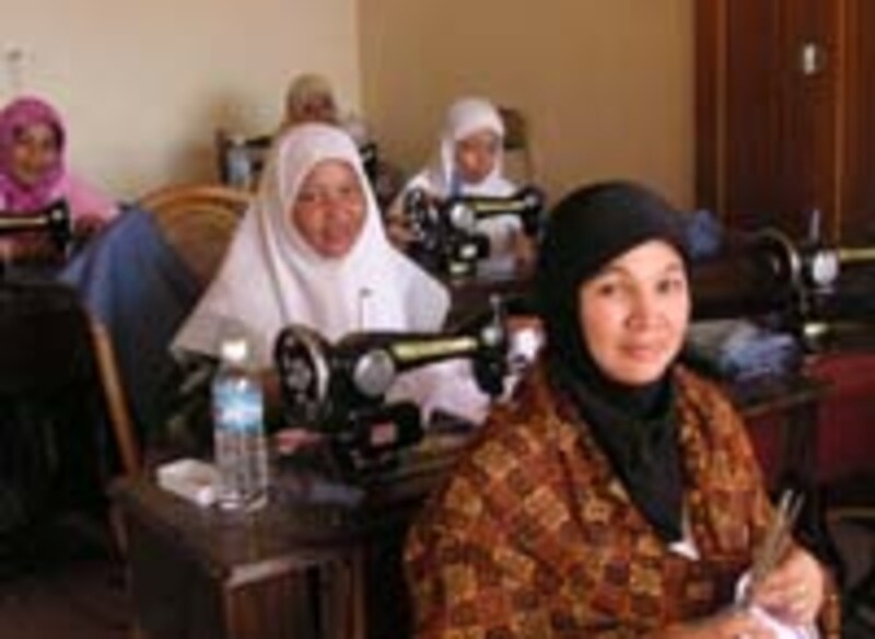 | PWJの収入向上プログラムに参加する女性たち。3月中旬から被災した小学生のための制服作りを依頼し、PWJが購入するという取り組みも実施した。©PWJ |