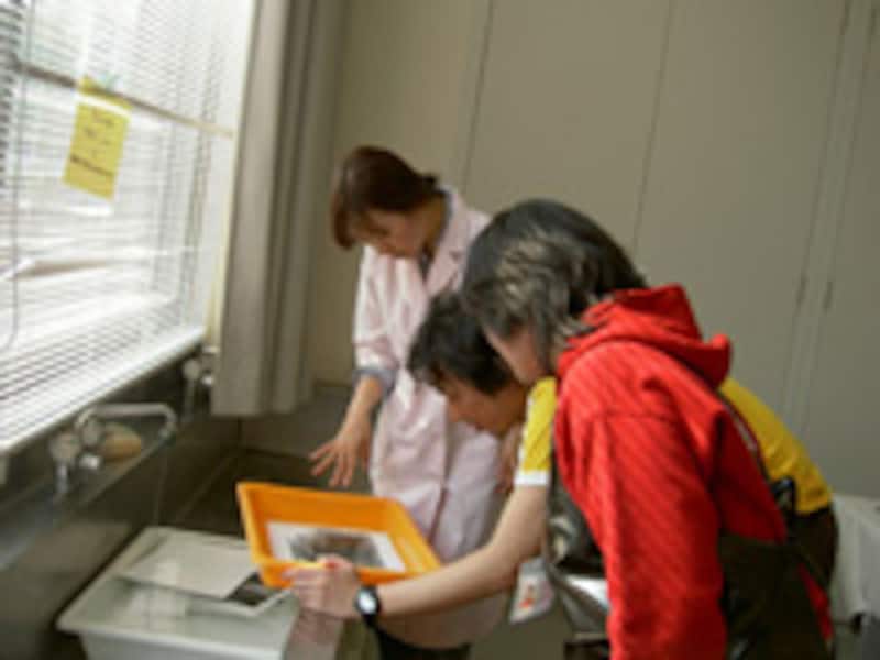 | 参加者のネガを選びサポートする。さりげなくそばにいて、やさしく声をかける姿はさすが。 |