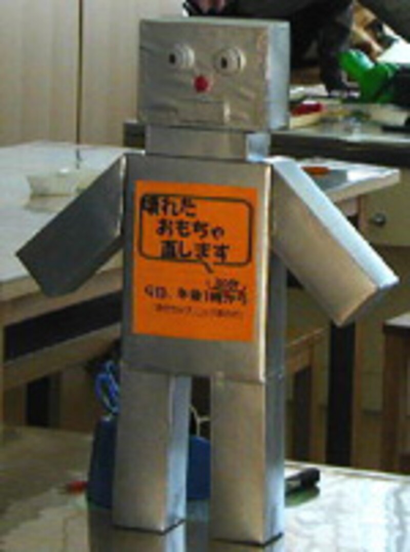 | あさかおもちゃクリニックの入り口では、手作り感たっぷりのロボットがお出迎え。毎月、第二土曜日に、溝沼児童館にて開催されている。 |