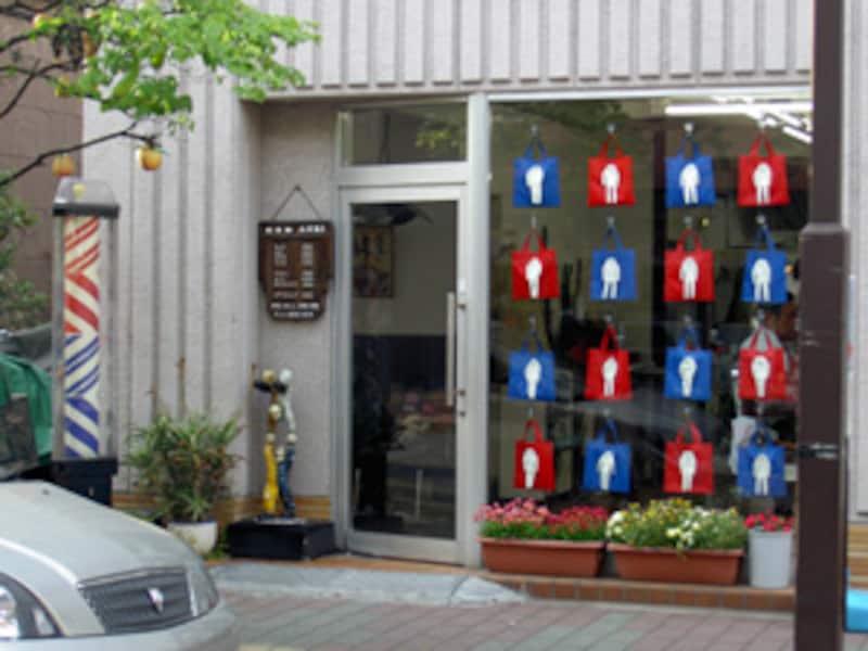 理髪店の店先は、おなじみのシンボルサインの色に合わせたオブジェに占領されちゃいました。