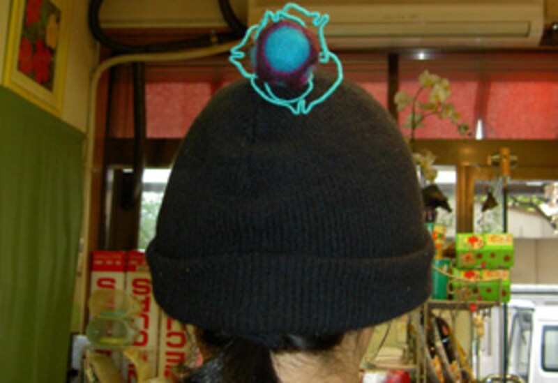 オブジェは、な、なんと、店長の頭の上にまで……。髪留めやマスコットなど様々な使い方を提案しているのだとか。ちなみに、このフェルトは、作家さんが自ら染めているそうで、深みのある色が素敵でした。