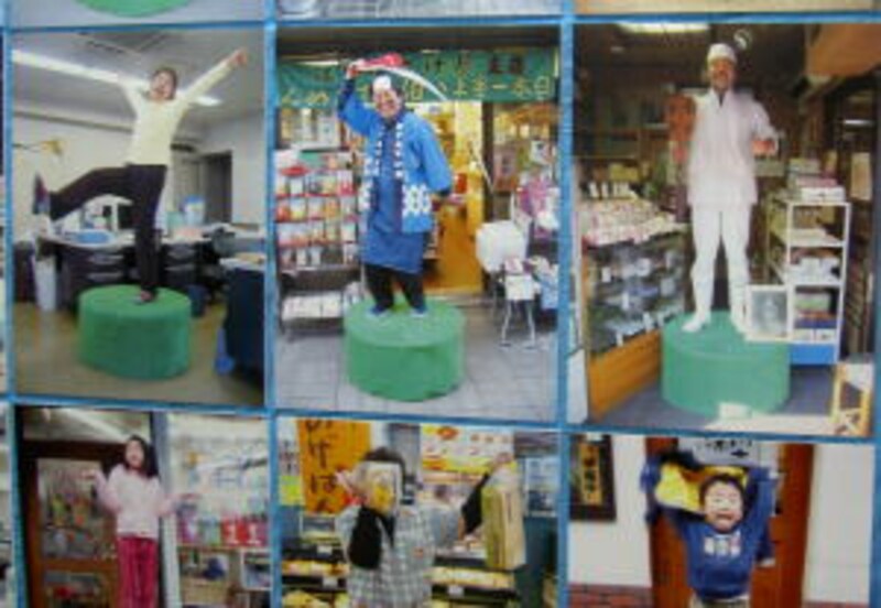 こちらは2人組のプロジェクト“ヤスモト飾案”の作品。写真のような台を持って商店街中を歩き、各店を訪ねては「この上でかかしになってください」と唐突な要望を出し、ポーズを取ってもらった写真展です。どうです、このポーズの数々。皆さん、さすがは商人!ですよね~。サービス精神たっぷりで、見ているほうも元気がもらえそうです。