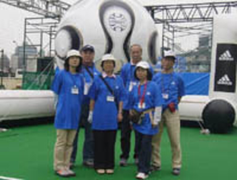 ここは、日本で最もW杯ドイツ大会に近い場所の1つ。国内で応援するサポーターの応援基地です。5月28日のオープンからわずか1週間で(つまりは開催前なのに)、すでに来場者は10万人を超えているほどのホットスポットとなっています。よこはま2002の皆さんも、フットサルを体験する人たちのサポートをしています。参加する子どもたちの笑顔をたくさん見られるのが、なによりうれしいボランティアです。