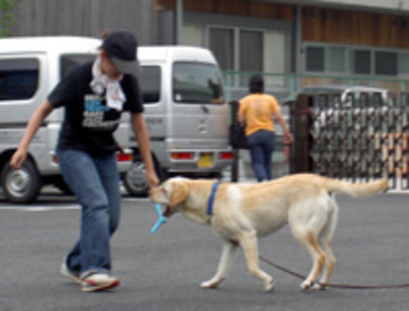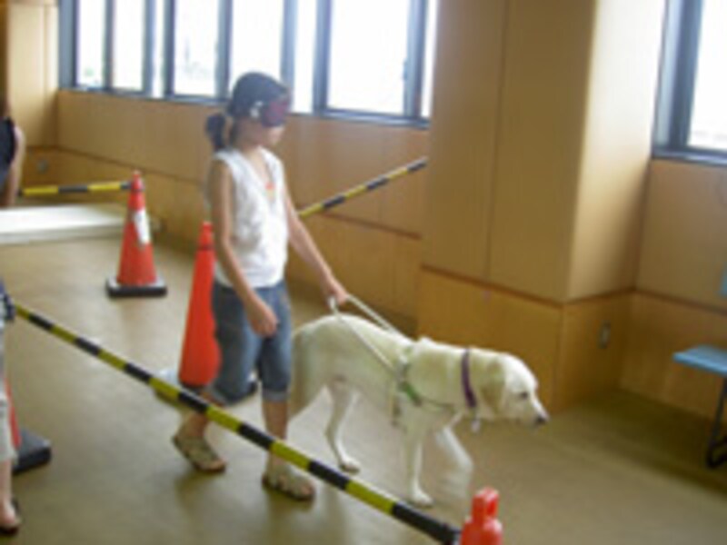 | 盲導犬を体験中。見学会にはお子さんの参加も目立ちます。こちらの女の子の将来の夢はズバリ訓練士なのだそうです。 |