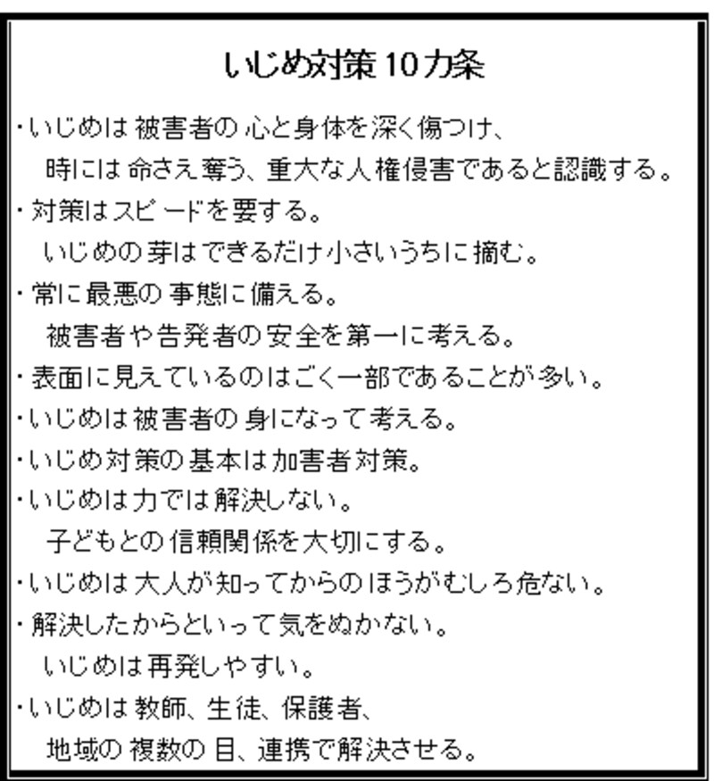 | 先生を対象に作った“いじめ対策10カ条”。いじめを知った周囲のすべての大人が考えていきたい10カ条です。 |