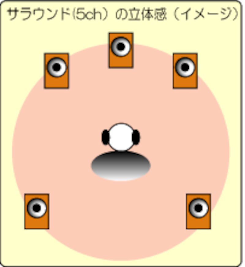 下図(右)のように、サラウンド(5ch)では、前後左右の組み合わせで、360度の立体感を表現できるようになります。
