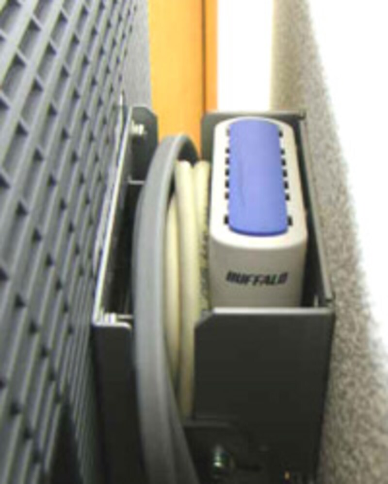 ちなみに、今回使用したのは、バッファロー WLI3-TX1-G54(実売価格は約7,000円)。 筐体が小さかったので、写真の通り、壁掛け金具の隙間にピッタリと収まり、大変満足。