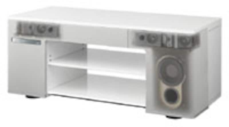必要なアンプやスピーカーは全て「テレビ台」に組み込まれている為、ホームシアターで敬遠されがちな、スピーカーの設置やケーブルの引き回しが不要。 省スペースで見た目もスッキリする上に、白と黒の2色が選べるので、インテリアを重視するユーザーにピッタリの製品です。