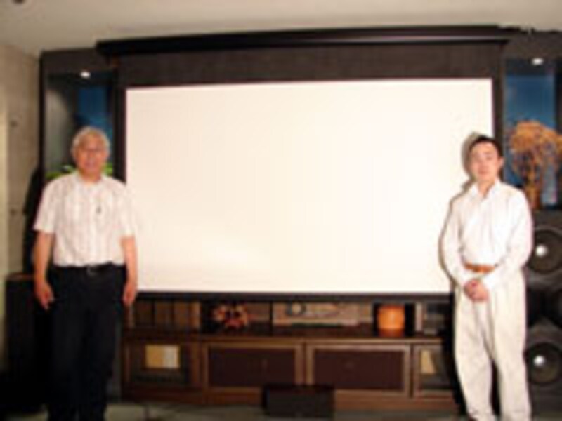 イーストンショールームにて、「E2S」100インチタイプと、イーストン社長東田氏(左)、ガイド鴻池(右)。 |