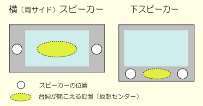 | * | 下(アンダー)スピーカーの場合、画面が大きくなればなるほど、画面の中央と、台詞が聞こえる位置が遠く離れ、違和感も大きくなる。 |