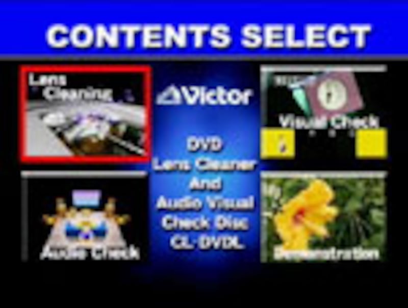 ■使い方 「CL-DVDLW」(湿式)では、先述の「毛」に、付属のクリーニング液を付けます。 その後は、まったくDVDを再生するのと同じ要領で、ディスクトレイに「CL-DVDLW」をセットします。 テレビ画面に写真のようなメニューが現れたら、DVDのリモコンで操作で「Lens Cleaning」を選ぶ(再生)するだけで、クリーニングが行われます。 |