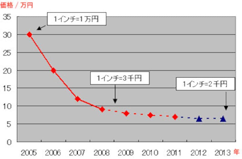 | ここ数年の価格下落を示したグラフ。 1インチ=1万円を切った頃から売れ始め、たった3年で、3分の1以下に。 |