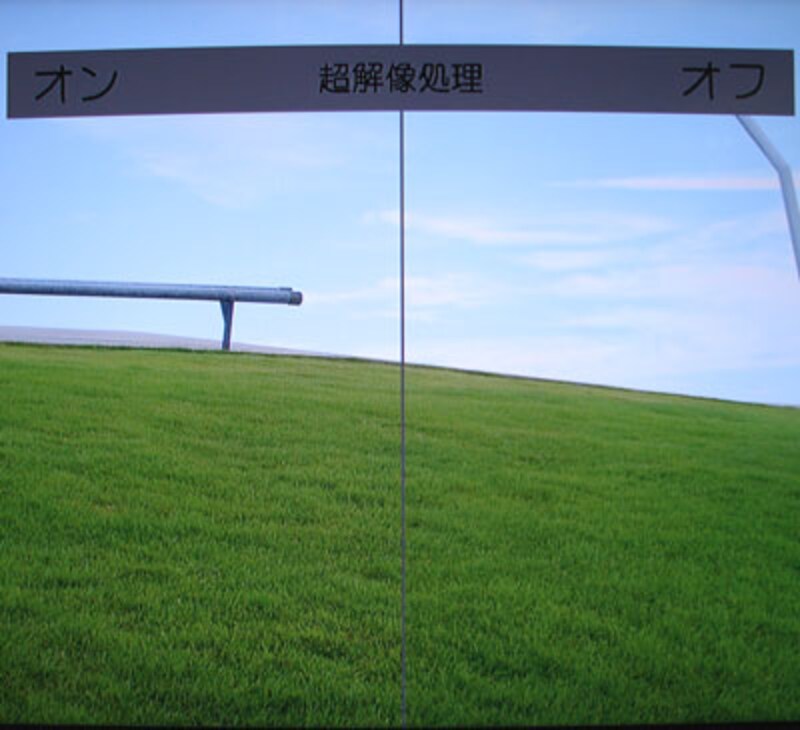 デモ映像を見ると、写真の「超解像処理 オン」は、芝生一本一本の質感が感じられるのに対し、「超解像処理 オフ」は、のっぺりとしているのが分かります。