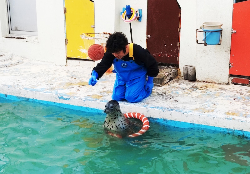ノシャップ寒流水族館には、北国ならではの珍しい魚やペンギンなど、120種約1300点が飼育展示されており、訪れる観光客の目を楽しませています。なかでも大人気なのが、当館一番人気のキャラクターであるゴマフアザラシ。この春誕生した赤ちゃんの名は、お姉ちゃんの「ポポ」ちゃんと弟の「ライ」君。愛らしい2頭の姿に、きっとあなたも夢中になるはずです。 生まれたばかりの2頭の赤ちゃんは、体全体が白い産毛で覆われており、白いぬいぐるみのようだったとのこと。母親に甘えたりお乳をおねだりするかわいい姿が地元メディアやSNSで取り上げられ、ゴマちゃん人気が急上昇しました。 生まれて100日を超えた現在、白い産毛姿から黒いゴマ模様に姿を変えたものの、赤ちゃんの雰囲気はそのまま。アザラシ池の横にある幼獣池を元気に泳ぎ回ったり、プールに浮かべられたおもちゃで遊んだりする愛らしいしぐさの一つひとつは、当館を訪れる人々の心を和ませてくれます。