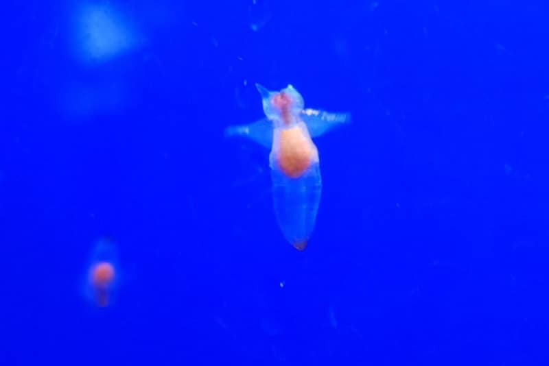 半透明の体から出る「天使の羽根(翼足)」を羽ばたくように動かして泳ぐ可憐なその姿から「流氷の天使」とも呼ばれ、ゴマフアザラシの赤ちゃんと人気を二分する水族館のアイドルとのこと。
