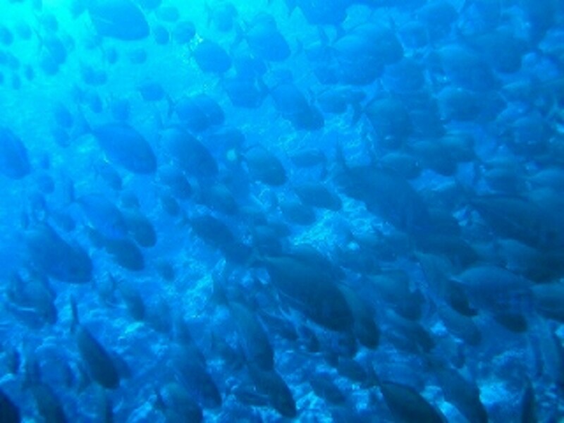 ダイビングは、トゥヘイアバ・パスがメイン。透明度がすこぶる高いです。壁に沿って潜るスタイルですが、それだけでジャンジャン大物が見られるのがスゴイ。魚の群れ(魚種は不明。魚にうとくてゴメンナサイ)があちこちで渦巻いていて、沖にはメジロザメらしきサメがウロウロと数匹見かけました。壁に色気はなかったのですが、魚の量が多く、ふむふむと納得してエキジットすると、「今日は透明度、悪くてごめんなさい」とガイドの一言。え、マジ。これで透明度が悪いのぉぉぉ!? ちなみに、この海域はダイビングの神様ジャック・イブ・クストーが魚影の濃さに驚いた場所です。