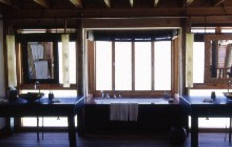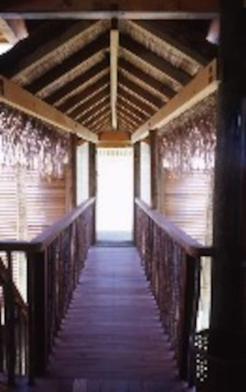 | シャワールームに続く廊下。海の上に渡された廊下からアプローチ |