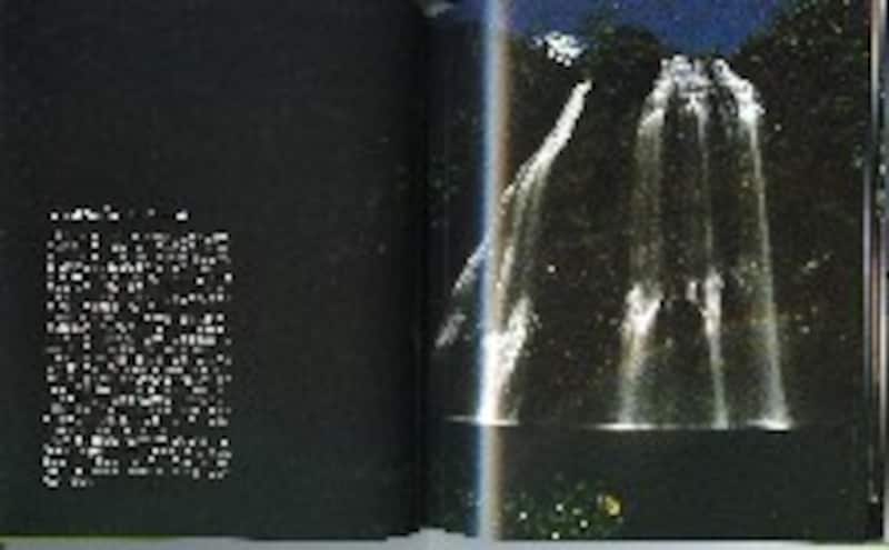 | ジンジャーの花のページ。夜、滝つぼへ下りた撮影秘話を披露。写真には月光に浮かぶ滝とナイトレインボーが |