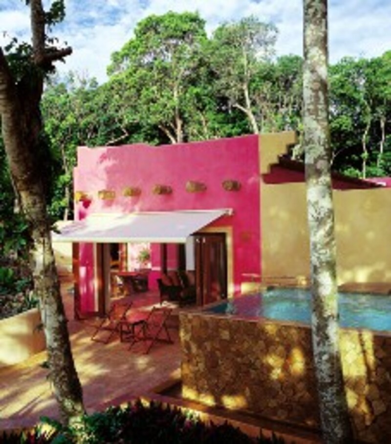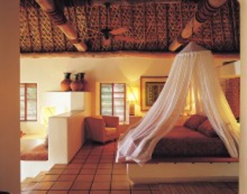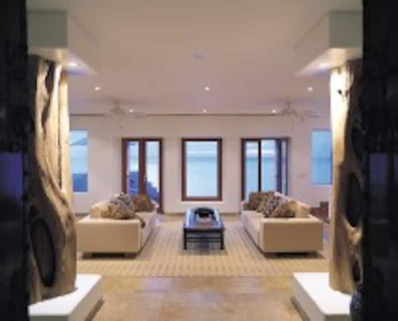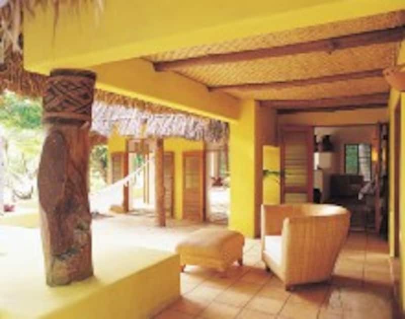 ひとつは、通称「ピンクハウス」という、ビーチの端っこにある邸宅風のおグランド・ブレ。ビビッドなピンク色の壁の、サンタフェ・スタイルです。プライベートプールをしつらえ、ベッドルーム、リビング、バスルームのほかにダイニングもあります。どれも、ゆとりある間取りで、大理石がふんだんに使用。バリから運んだ家具とフィジーの伝統工芸の絵画が目を楽しませてくれます。