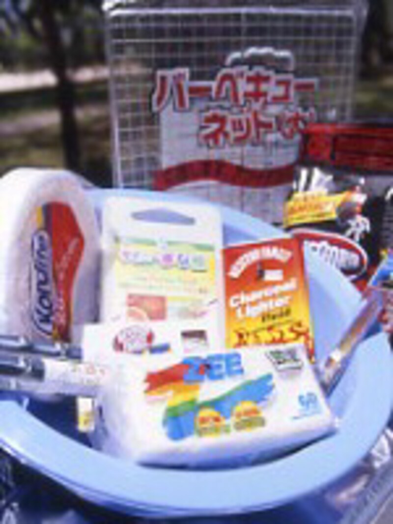 ■材料を買出しにディスカウントストアで調理器具を調達。燃料やバーベキューネット、紙皿、フォーク、トングなど。それからスーパーで食材探し。チキンドラムやソーセージ、とうもろこしに玉ねぎ、おにぎりなどお好みで。肉のパックはアメリカンサイズなので、買いすぎに注意しましょう。ちなみに、日本でおなじみの焼肉のたれもあります。予算はピンきりですが、調理器具関係US$20、食材関係US$20ぐらいでしょうか。