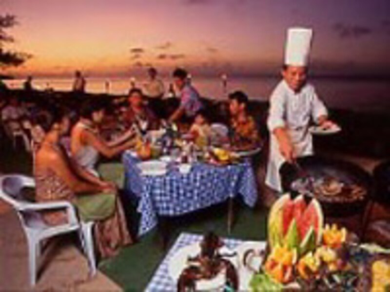 サンセットビーチ・バーベキューは全部で4セレクション。たとえば、シーフードセレクションならば、活きメインロブスター、ニュージーランド産ムール貝、エビ、マヒマヒのステーキ、ローカルフィッシュのステーキ、帆立のベーコン巻きにナチョスやベジタブルスティック、焼きおにぎり、焼きマシュマロ、アイスクリームなどがつきます(大人US$50、子供US$30)。