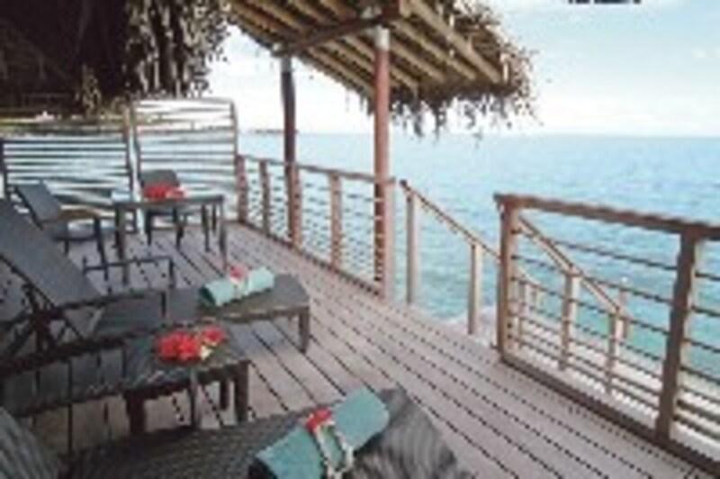 バスタブは2面がガラスになっていて、お湯につかりながら海が望められます。ラグーンに張り出したテラスからももちろん、海が眺められますし、そのままステップを降りてシュノーケリングを楽しむことも。