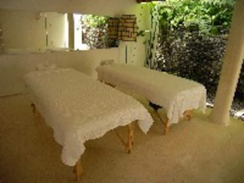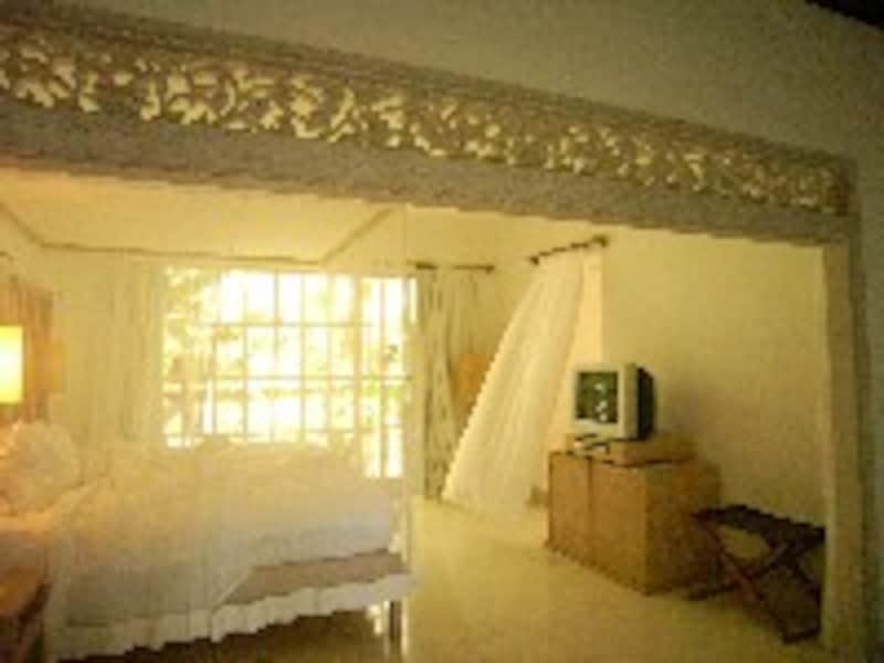 アランアランで葺いた屋根の客室棟は、洗いさらしたような白を基調とし、ムダをそぎ落としつつも、自然素材のやさしさが伝わる風合いです。インテリア・アーキテクトはKoichiro Ikebuchiさんという、日本人のデザイナーが担当しています。テレビやDVD、ミニバー、そしてヨガマットも用意。とはいえ、テレビを見ることを忘れてしまうくらい、鳥のさえずりや虫の音など、自然が奏でる音に耳を奪われてしまいます。