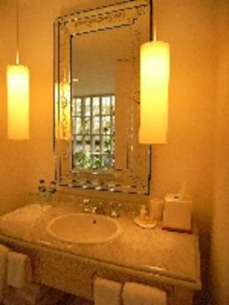 今回泊まったのは、ウマ・プール・スイート。広いリビングとロマンチックなベッドルーム、庭に面したテラスといい、心地いい空間がちりばめられています。なんといっても愛らしいのはバスルーム。切子細工のようなカットがほどこされた鏡に、薫り高いアメニティ、もう女心を鷲づかみです。バスタブも水量たっぷりのレインシャワーも使い勝手よし!