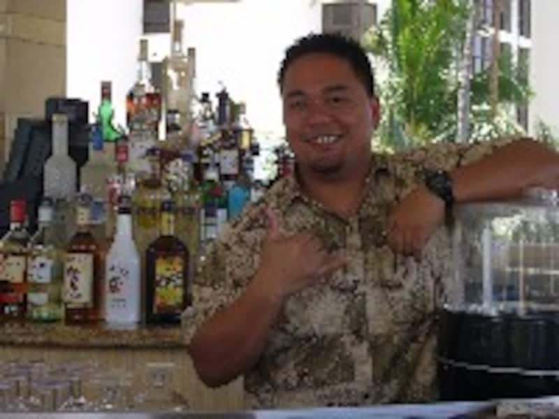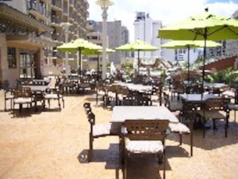 | ワイキキ・ビーチ・ウォークを望むテラスのレストラン。屋根付きのスペースもあります |