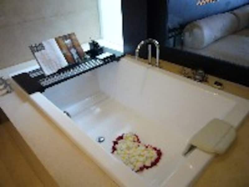 | ハネムーナーにはお部屋とバスタブにお花のデコレーションが |