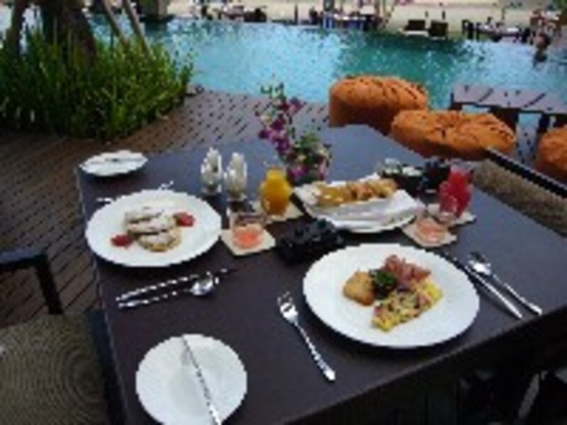 朝食は海沿いのインフィニティエッジのプールに面したザ・パオンで。パン類やフルーツなどはビュッフェスタイルですが、