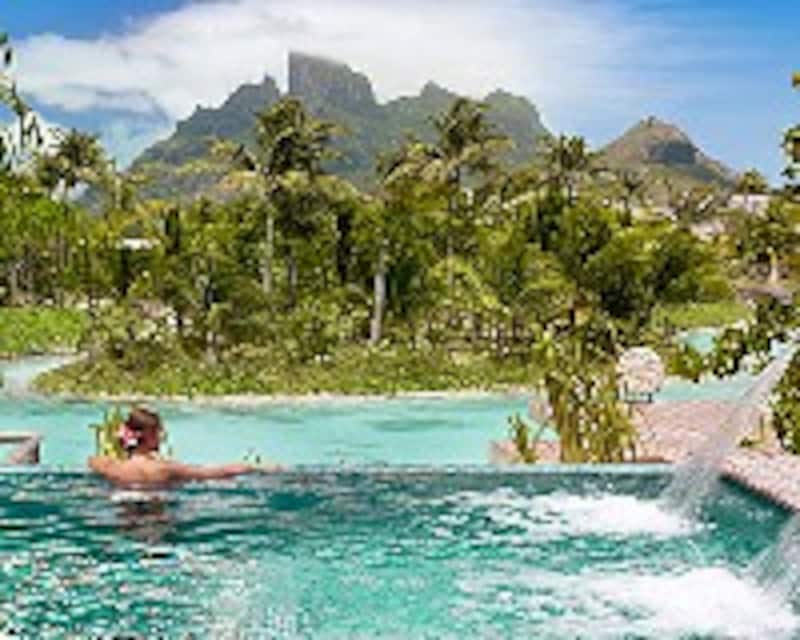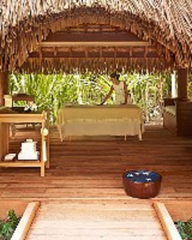 リゾートのあるモツ(小島)のいちばん高い位置にあるのが、ザ・スパ アット フォーシーズンズ ボラボラです。周囲をみずみずしい緑のカハイア(和名ハテルマギリ)など熱帯の樹木に囲まれたスパは、天井の高さがなんと22m! 思わず見上げてしまうことでしょう。