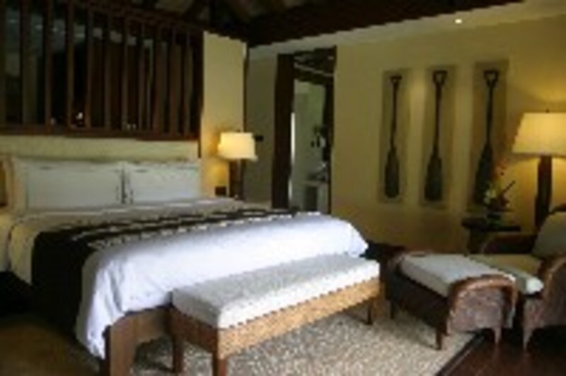 ゲストルームは36棟のヴィラを含む219室。標準のデラックスルームでも60平方メートルあり、海を望むバルコニー付き。真っ白な天井は高く、梁が走り、どことなくマリンテイストを感じます。