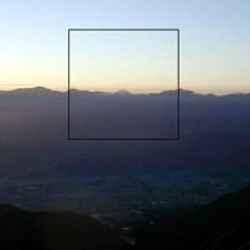 | 南アルプス連峰と富士山。下は朝が未だ明けていない駒ヶ根市々街。上の写真は四角で囲んだ部分 |