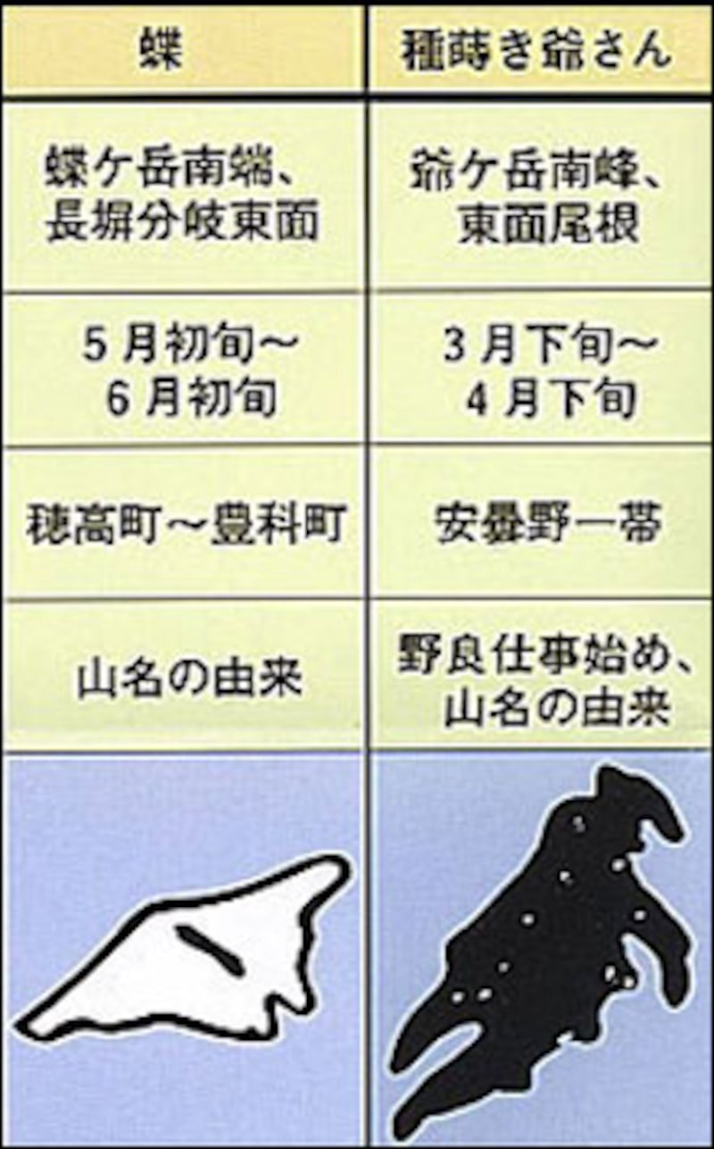 今でこそ、天気予報などで、気象の動きを知ることが出来ますが、昔の農作業は農事暦に頼るしかありませんでした。しかし春の訪れの遅い信州では、この農事暦は通用せず、専らこの雪形の出現によって農作業の開始を決めていました。爺ヶ岳の種蒔き爺さんなど農作業に関連の深い名前は、そういう故事を如実に示してます。