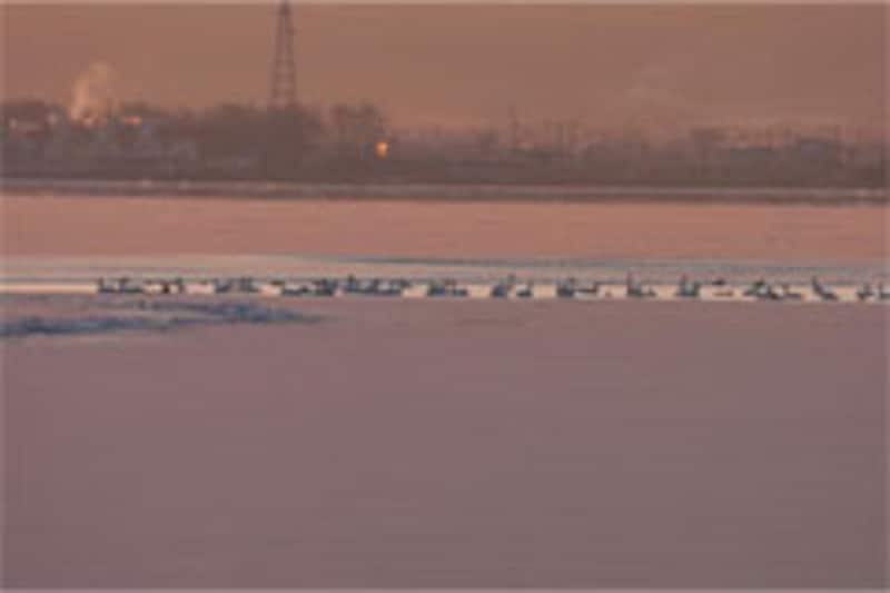 右の写真が、400mm望遠レンズ(35mmでは640mm相当の画角)で目いっぱい大きくして撮ったねぐらの白鳥の様子を収めたものだという。