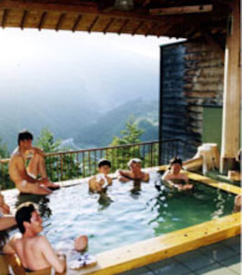 前が開けた明るい露天風呂からは、眼下に小渋川の渓谷を望み、遠くに雪の残る中央アルプス駒ヶ岳を展望する。正に天空の湯殿に浸かるという形容が適切なお風呂です。