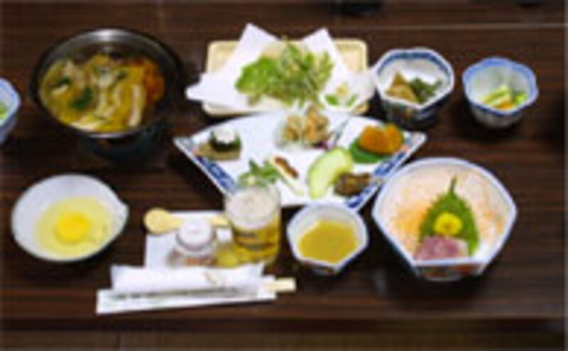 前菜・茶碗蒸し・鯰(なまず)柳川・鯉のあらい・山菜天ぷら・舞茸ご飯・みそ汁・大鹿産野沢菜漬・特別料理(お薦めの冷や奴\500・岩魚の塩焼き\1,000)と山辺の宿らしく地でとれた旬の食材を使った料理が並び、どれも美味しく頂けます。特別料理は他にも鹿刺し(\1,000)・岩魚骨酒など季節料理が多数用意されています。