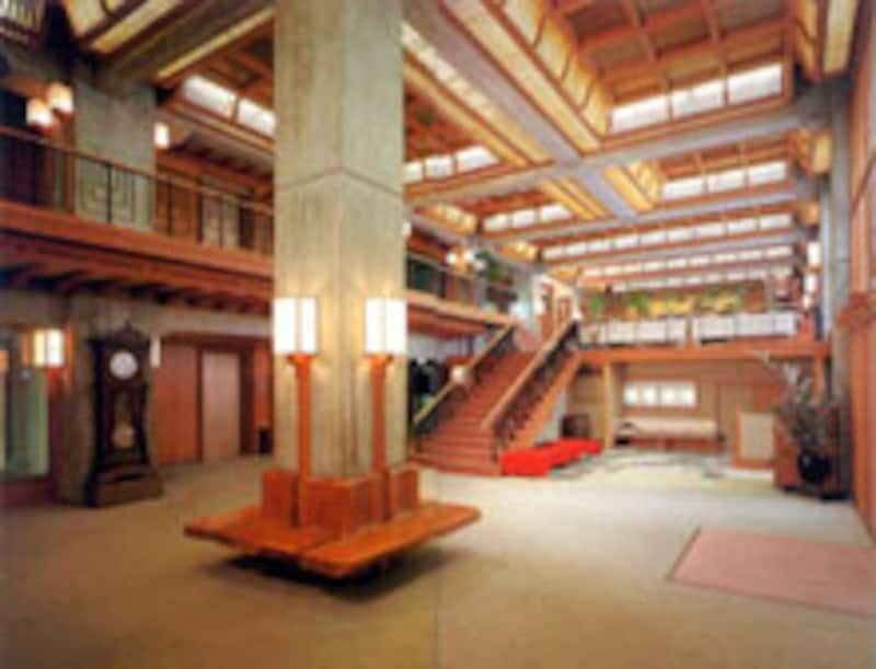 | よろづやのロビー 左手にフロント・右奥二階はラウンジ |