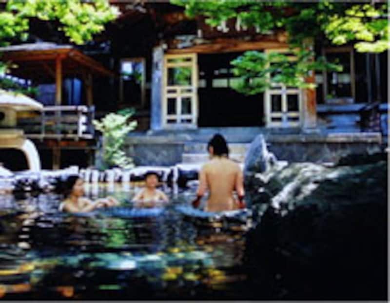 「よろづや」には、広い大湯殿と野天風呂付きの「桃山風呂」と「東雲(しののめ)風呂」の二式 の温泉風呂があり、夜の9時半で男女を交代して利用出来る仕組みになっています。そのほかに有料ですが、これも20名同時入浴可能だという貸切の「黄鶴(こうかく)風呂」もあります。フロントで鍵を借りれば、前にある外湯「大湯」が無料で使えます。