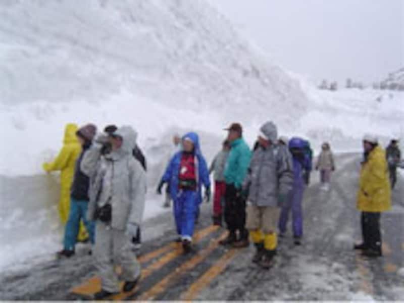 冬季閉鎖されていた高原ルートの開通式です。先着10台にミス志賀高原より記念品贈呈。テープカット・記念品プレゼントの後、警察パトカーを先導として渋峠まで、一般車両を含めて初走行を行います。道路両サイドにそそり立つ雪壁と遠くアルプスの峰々を仰ぎ、国道標高最高地点(2172m)を目指します。